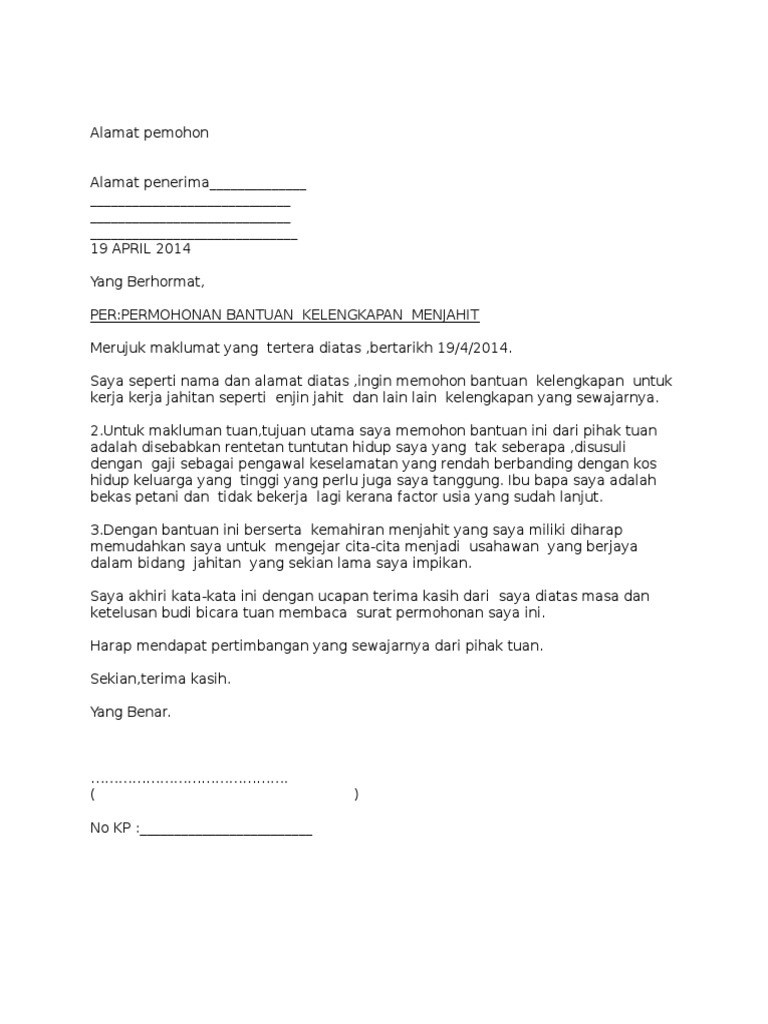 Contoh Surat Permohonan Bantuan Kelengkapan Menjahit Pdf